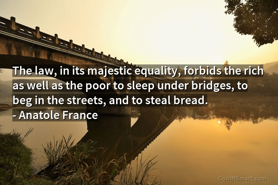 “The law, in its majestic equality, forbids the rich as well as the poor to sleep under bridges, to beg in the streets, and to steal bread.” -Anatole France, novelist, essayist, Nobel laureate (16 Apr 1844-1924)