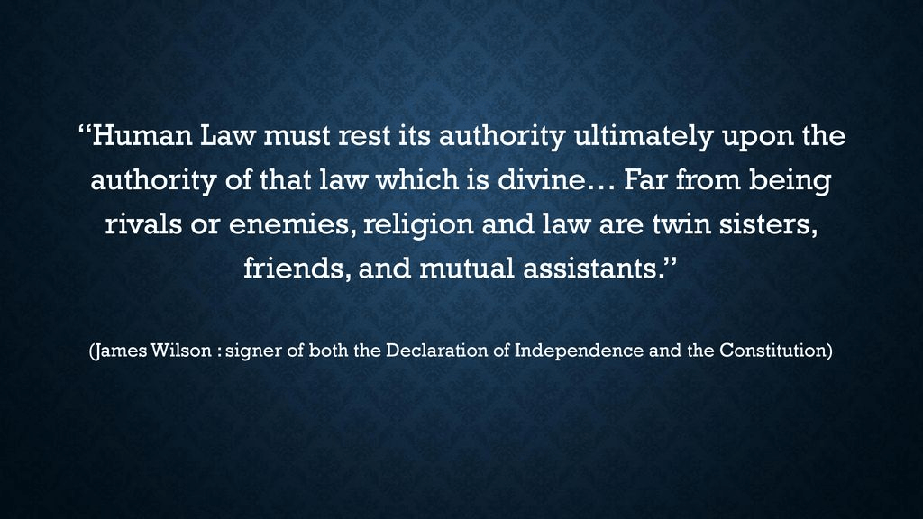 “Human law must rest its authority ultimately upon the authority of that law which is divine. Far from being rivals or enemies religion and law are twin sisters, friends, and mutual assistance. Indeed, these two sciences run into each other.‘ – James Wilson, in The Works of the Honourable James Wilson (Philadelphia: Bronson and Chauncey, 1804), Vol. I, pp. 106 & 103-105.