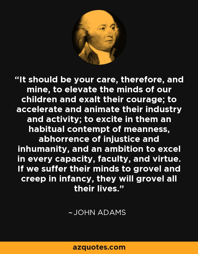 “It should be your care, therefore, and mine, to elevate the minds of our children and exalt their courage… If we suffer their minds to grovel and creep in infancy, they will grovel all their lives.” – John Adams (1756)