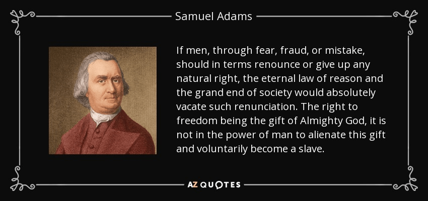 “If men through fear, fraud or mistake, should in terms renounce and give up any essential natural right, the eternal law of reason and the great end of society, would absolutely vacate such renunciation; the right to freedom being the gift of God Almighty, it is not in the power of Man to alienate this gift, and voluntarily become a slave.” – Samuel Adams (1772)