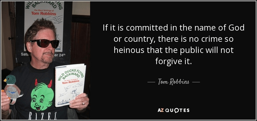 “If it is committed in the name of God or country, there is no crime so heinous that the public will not forgive it.” – Tom Robbins, writer (b. 22 Jul 1936)
