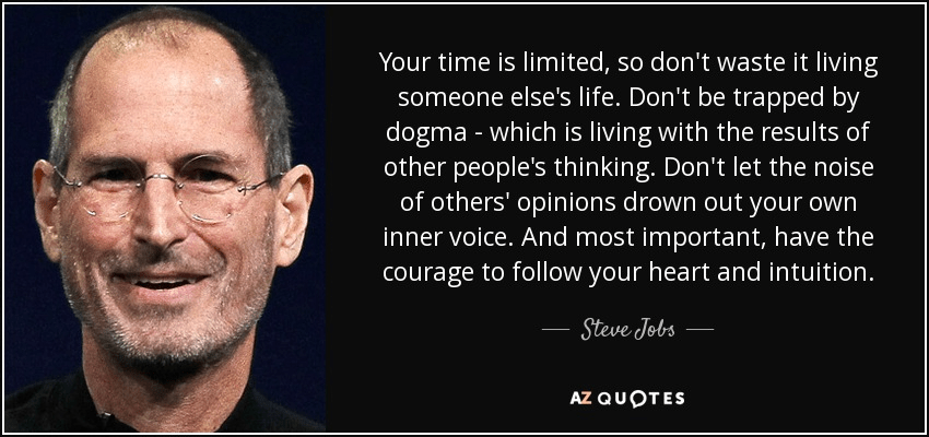 “Your time is limited, so don’t waste it living someone else’s life. Don’t be trapped by dogma – which is living with the results of other people’s thinking. Don’t let the noise of others’ opinions drown out your own inner voice. And most important, have the courage to follow your heart and intuition.” – Steve Jobs