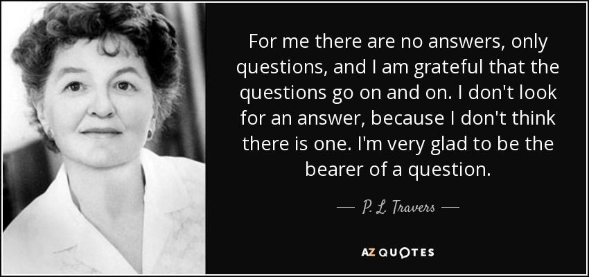“For me there are no answers, only questions, and I am grateful that the questions go on and on. I don’t look for an answer, because I don’t think there is one. I’m very glad to be the bearer of a question.” – P.L. Travers
