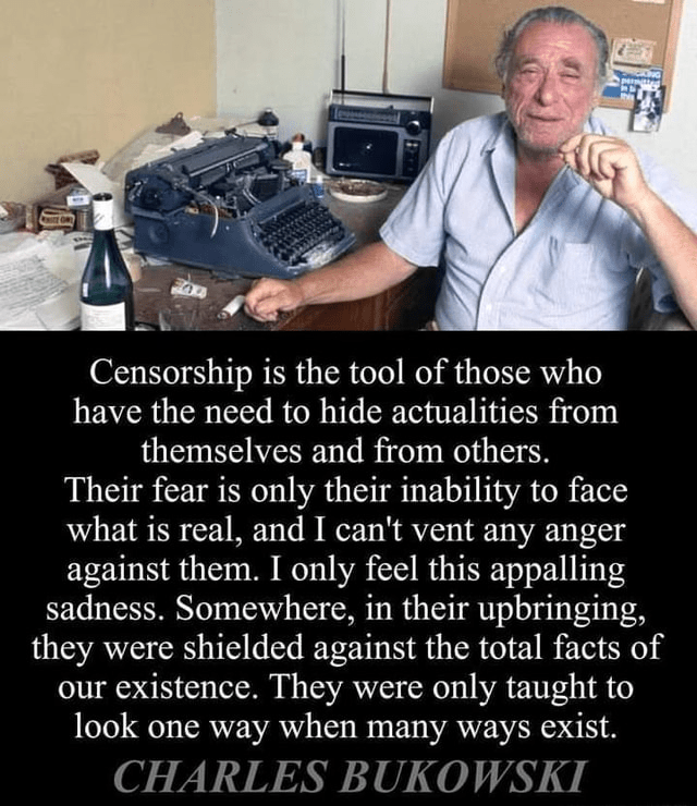 “Censorship is the tool of those who have the need to hide actualities from themselves and from others. Their fear is only their inability to face what is real, and I can’t vent any anger against them. I only feel this appalling sadness. Somewhere, in their upbringing, they were shielded against the total facts of our existence.” – Charles Bukowski