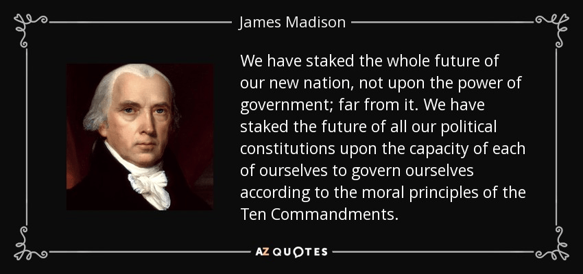 “We have staked the whole future of our new nation, not upon the power of government; far from it. We have staked the future of all our political constitutions upon the capacity of each of ourselves to govern ourselves according to the moral principles of the Ten Commandments.” – James Madison