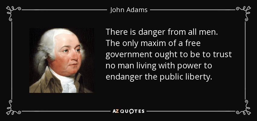“There is danger from all men. The only maxim of a free government ought to be to trust no man living with power to endanger the public liberty.” – John Adams