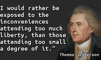 “I would rather be exposed to the inconveniencies attending too much liberty than those attending too small a degree of it.” – Thomas Jefferson (1791)