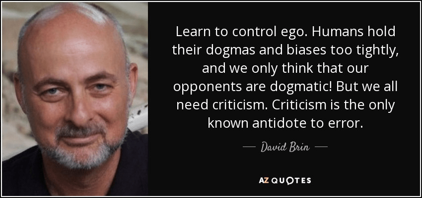 “Learn to control ego. Humans hold their dogmas and biases too tightly, and we only think that our opponents are dogmatic! But we all need criticism. Criticism is the only known antidote to error.” – David Brin