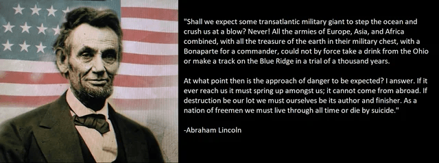 “If destruction be our lot, we must ourselves be its author and finisher. As a nation of freemen, we must live through all time, or die by suicide.“ – Abraham Lincoln