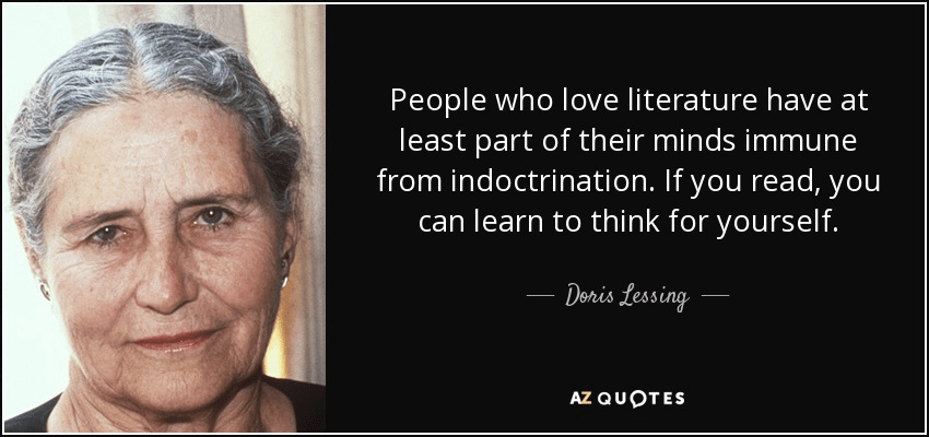 “People who love literature have at least part of their minds immune from indoctrination. If you read, you can learn to think for yourself.” – Doris Lessing