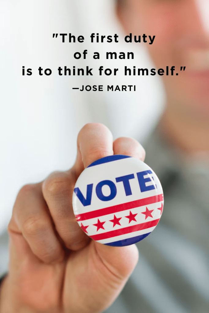 This is only a partial quote. The full quote is “The first duty of a man is to think for himself. For that reason I do not want you to respect the priest, because he will not let you think.” and is taken from a short tract Marti authored called “Hombre del campo” (The Countryman). This tract was written to oppose unscrupulous priests who used the teachings of Christ to influence political matters. Marti believed the Roman Catholic Church was acting wrongly and that church and state should be separated. It was Marti’s belief that Christianity had died under Roman Catholicism, which is used for political measures. As time has passed, the quote has been shortened to the fundamental truth that each person should think for themselves and be guided by their own conscience. This is particularly appropriate when approaching voting as we do today in the United States.