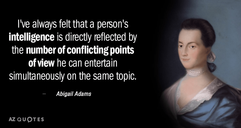 “I’ve always felt that a person’s intelligence is directly reflected by the number of conflicting points of view he can entertain simultaneously on the same topic.” – Abigail Adams, “Letters of Mrs. Adams: The Wife of John Adams”, p.539