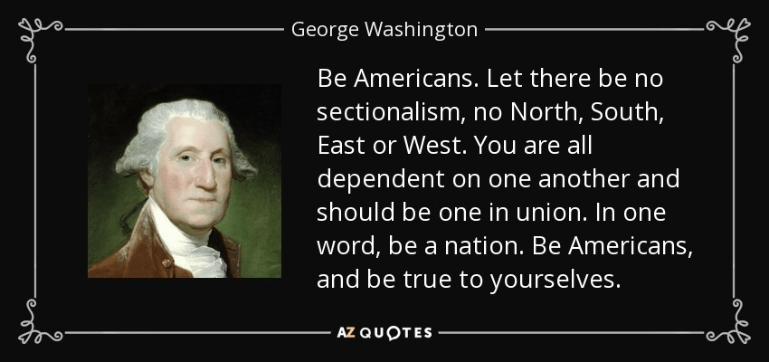 “Be Americans. Let there be no sectionalism, no North, South, East or West. You are all dependent on one another and should be one in union. In one word, be a nation. Be Americans, and be true to yourselves.” – George Washington, Washington’s Farewell Address, published in the Claypoole’s American Daily Advertiser (September 19, 1796)
