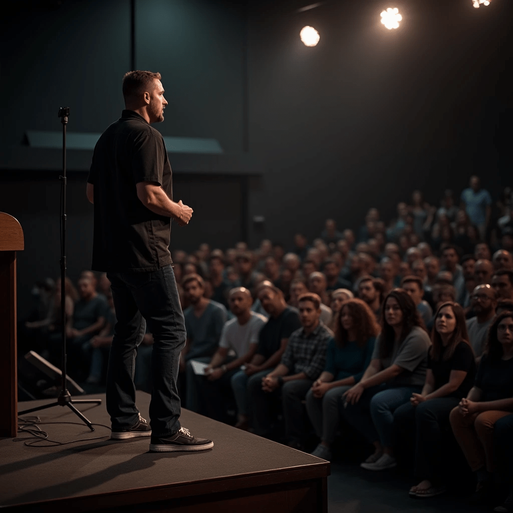 Past all the great and well-known speakers Is the preacher in comfortable sneakers He's giving a shout-out about Revelation As he provides a succinct explanation