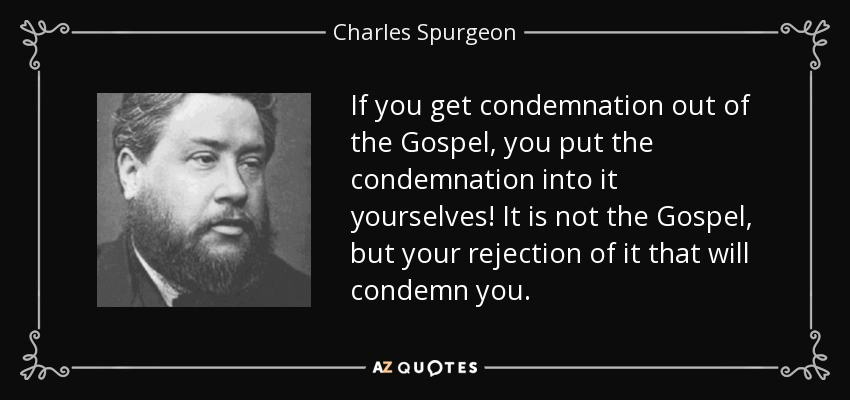 “If you get condemnation out of the Gospel, you put the condemnation into it yourselves! It is not the Gospel, but your rejection of it that will condemn you.” – Charles Spurgeon