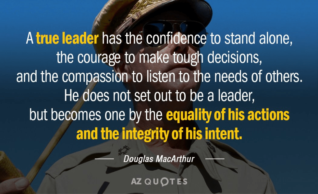 “A true leader has the confidence to stand alone, the courage to make tough decisions, and the compassion to listen to the needs of others. He does not set out to be a leader, but becomes one by the equality of his actions and the integrity of his intent.” – Douglas MacArthur