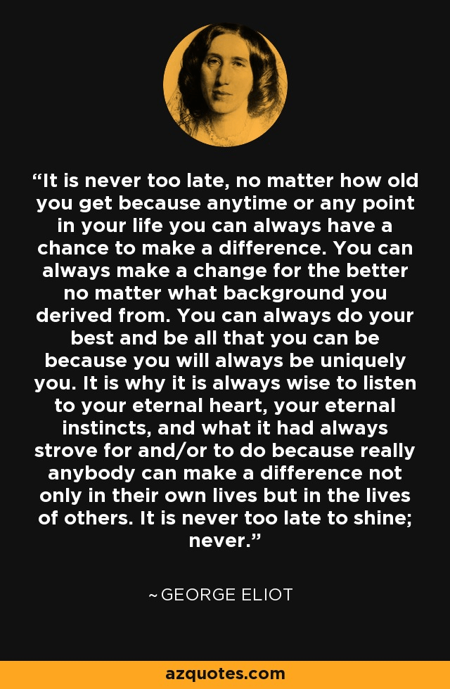 “It is never too late to become the person you always thought you could be.” – George Eliot (Mary Ann Evans), novelist (22 Nov 1819-1880)