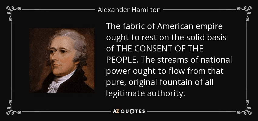 “The fabric of American empire ought to rest on the solid basis of THE CONSENT OF THE PEOPLE. The streams of national power ought to flow from that pure, original fountain of all legitimate authority.” – Alexander Hamilton (1787)