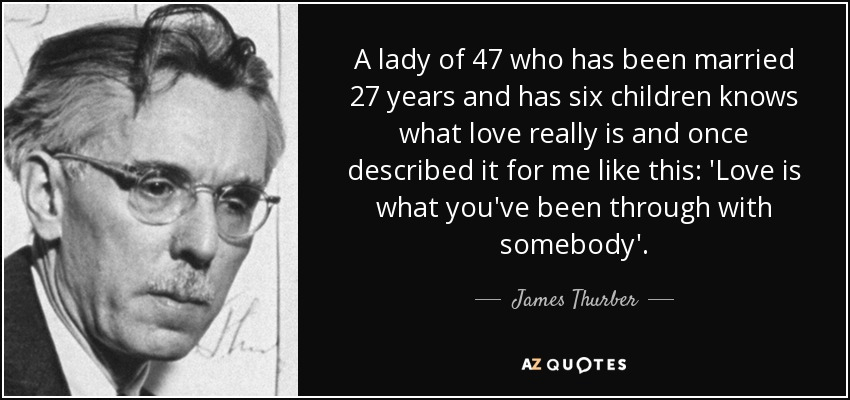 “A lady of 47 who has been married 27 years and has six children knows what love really is and once described it for me like this: ‘Love is what you’ve been through with somebody.;” – James Thurber