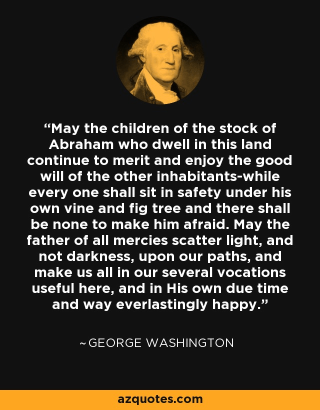 “May the father of all mercies scatter light, and not darkness, upon our paths, and make us in all our several vocations useful here, and in His own due time and way everlastingly happy.” – George Washington (1790)