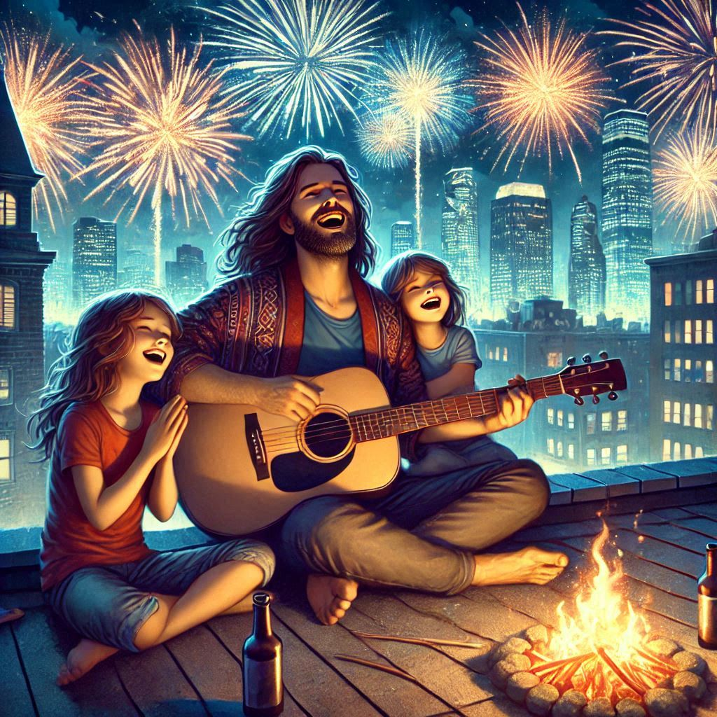 At midnight, we'll toast the fireworks flying high Dancing across this city's unlit portions of the sky We will think about the good and bad of so many things Until someone plays guitar while another sings