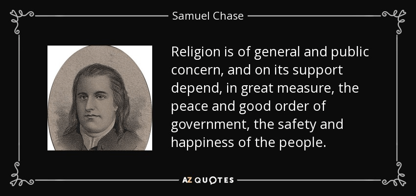 “Religion is of general and public concern, and on its support depend, in great measure, the peace and good order of government, the safety and happiness of the people. By our form of government, the Christian religion is the established religion; and all sects and denominations of Christians are placed upon the same equal footing, and are equally entitled to protection in their religious liberty.” – Samuel Chase, Runkel v. Winemiller (1799)