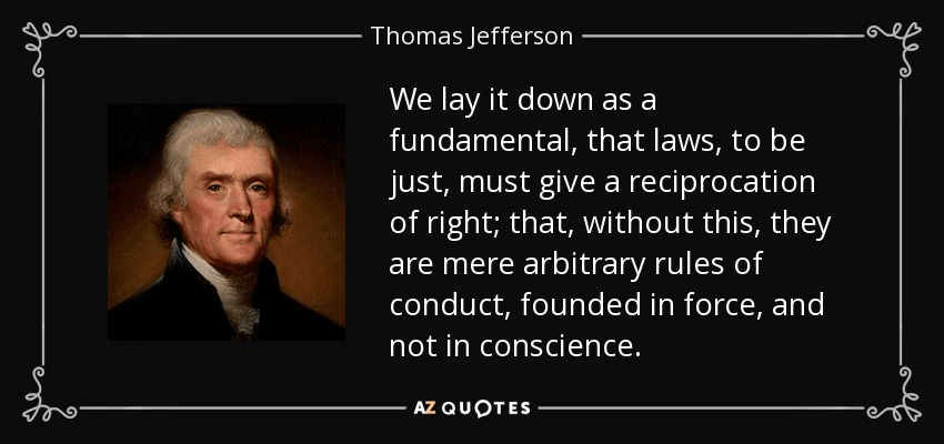 “We lay it down as a fundamental, that laws, to be just, must give a reciprocation of right; that, without this, they are mere arbitrary rules of conduct, founded in force, and not in conscience.” – Thomas Jefferson (1782)