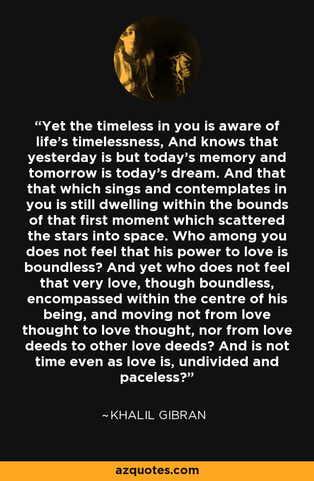 “The timeless in you is aware of life’s timelessness. And knows that yesterday is but today’s memory and tomorrow is today’s dream.” – Kahlil Gibran, in The Prophet