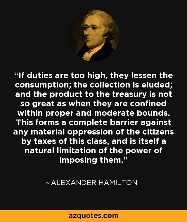 “If duties are too high, they lessen the consumption; the collection is eluded; and the product to the treasury is not so great as when they are confined within proper and moderate bounds. This forms a complete barrier against any material oppression of the citizens by taxes of this class, and is itself a natural limitation of the power of imposing them.” – Alexander Hamilton