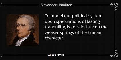 “To model our political systems upon speculations of lasting tranquillity would be to calculate on the weaker springs of human character.” – Alexander Hamilton (1788)