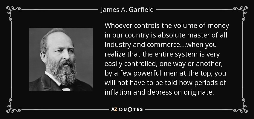 “Whoever controls the volume of money in our country is absolute master of all industry and commerce…when you realize that the entire system is very easily controlled, one way or another, by a few powerful men at the top, you will not have to be told how periods of inflation and depression originate.” – James A. Garfield