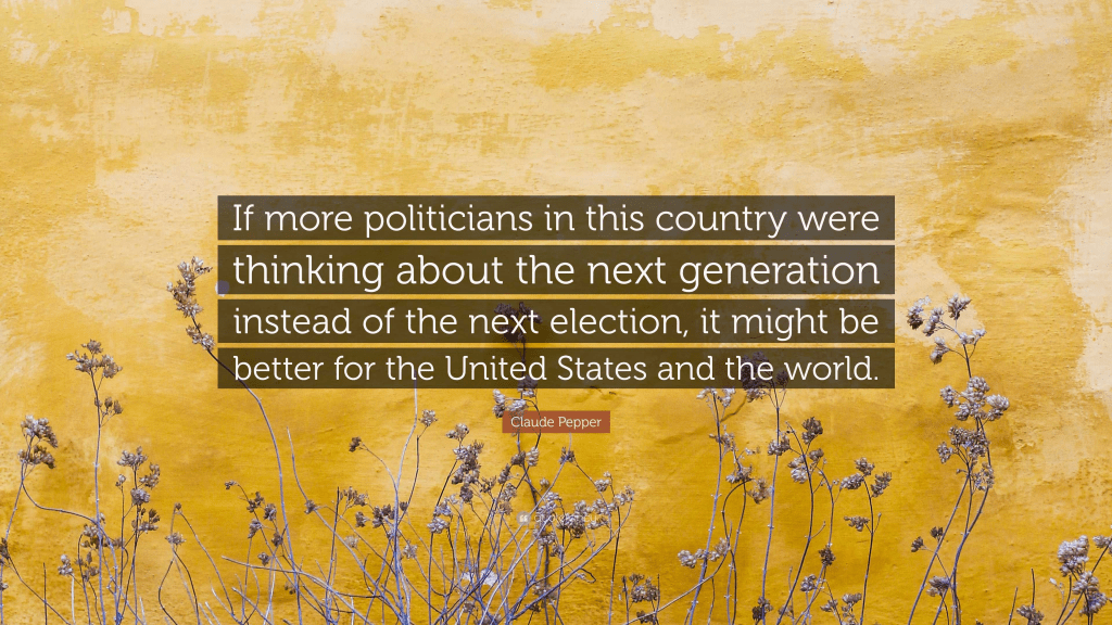 “If more politicians in this country were thinking about the next generation instead of the next election, it might be better for the United States and the world.” -Claude Pepper, senator and representative (8 Sep 1900-1989)
