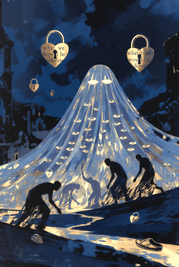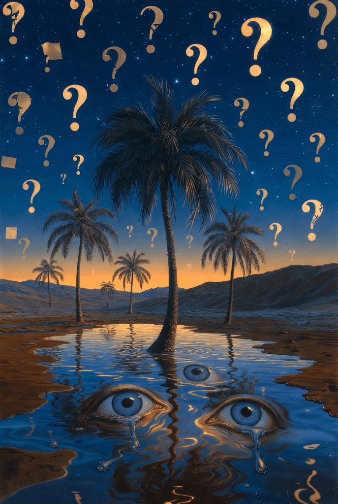 Tears flash into a swift flowing flood, An oasis can hold onto too much sorrow. Afghani sandals get stuck in time's mud Fleeing from every yesterday's tomorrow.