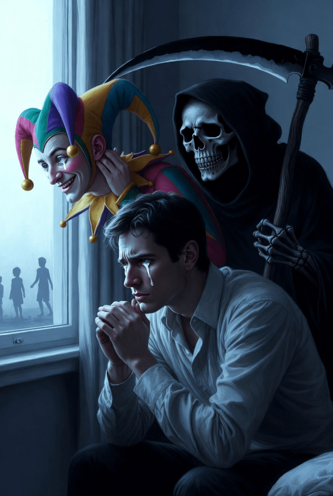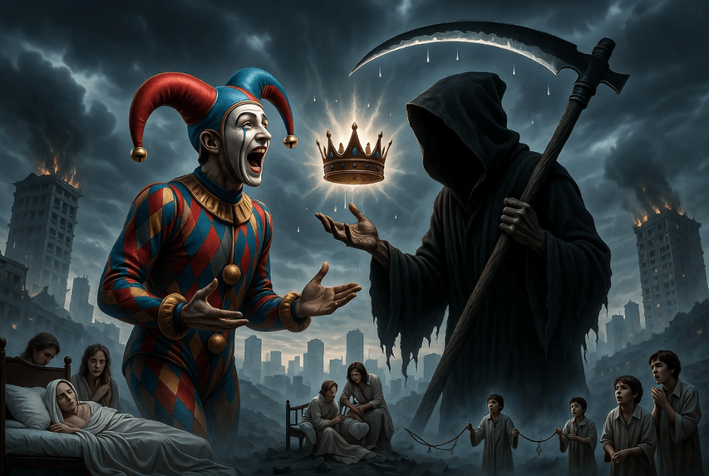 A widowed mother dies n her bed Love for her family, the thought in her head. As great cities crumble and burn down, The Jester and the Reaper fight for the crown.