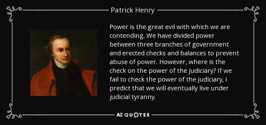 “Power is the great evil with which we are contending. We have divided power between three branches of government and erected checks and balances to prevent abuse of power. However, where is the check on the power of the judiciary? If we fail to check the power of the judiciary, I predict that we will eventually live under judicial tyranny.” – Patrick Henry