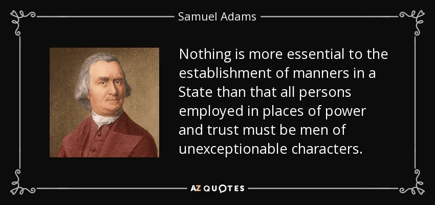 “Nothing is more essential to the establishment of manners in a State than that all persons employed in places of power and trust must be men of unexceptionable characters.” – Samuel Adams (1775)
