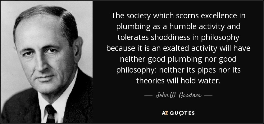 “We must learn to honor excellence in every socially accepted human activity, however humble the activity, and to scorn shoddiness, however exalted the activity. An excellent plumber is infinitely more admirable than an incompetent philosopher. The society that scorns excellence in plumbing because plumbing is a humble activity and tolerates shoddiness in philosophy because it is an exalted activity will have neither good plumbing nor good philosophy. Neither its pipes nor its theories will hold water”. – John W. Gardner, author and leader (8 Oct 1912-2002)