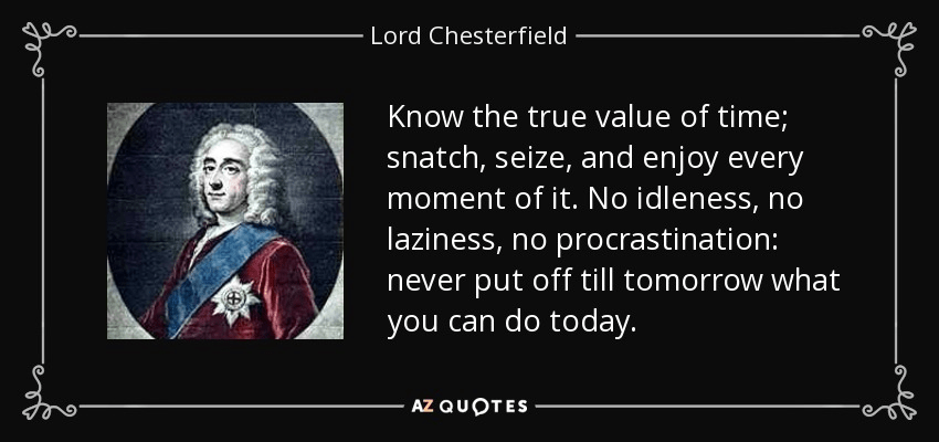 “Know the true value of time; snatch, seize, and enjoy every moment of it. No idleness, no laziness, no procrastination: never put off till tomorrow what you can do today.” – Lord Chesterfield