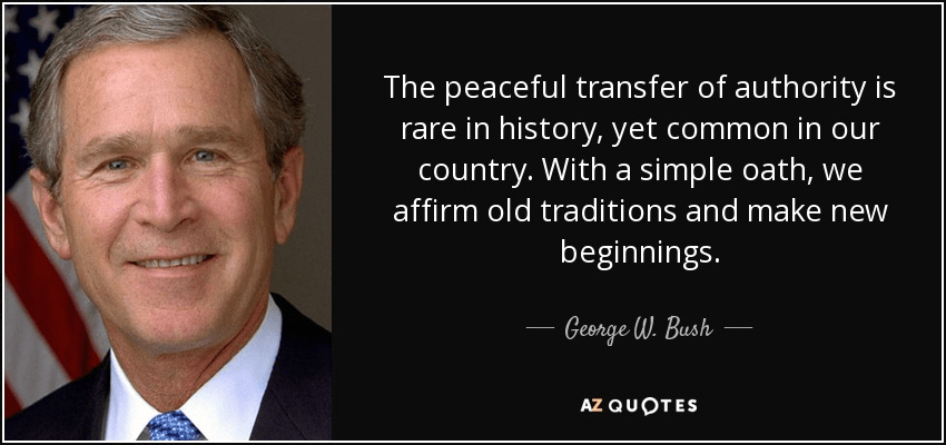“The peaceful transfer of authority is rare in history, yet common in our country. With a simple oath, we affirm old traditions and make new beginnings.” – George W. Bush