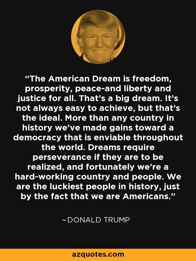 “The American Dream is freedom, prosperity, peace-and liberty and justice for all. That’s a big dream. It’s not always easy to achieve, but that’s the ideal. More than any country in history we’ve made gains toward a democracy that is enviable throughout the world. Dreams require perseverance if they are to be realized, and fortunately we’re a hard-working country and people. We are the luckiest people in history, just by the fact that we are Americans.” – Donald Trump