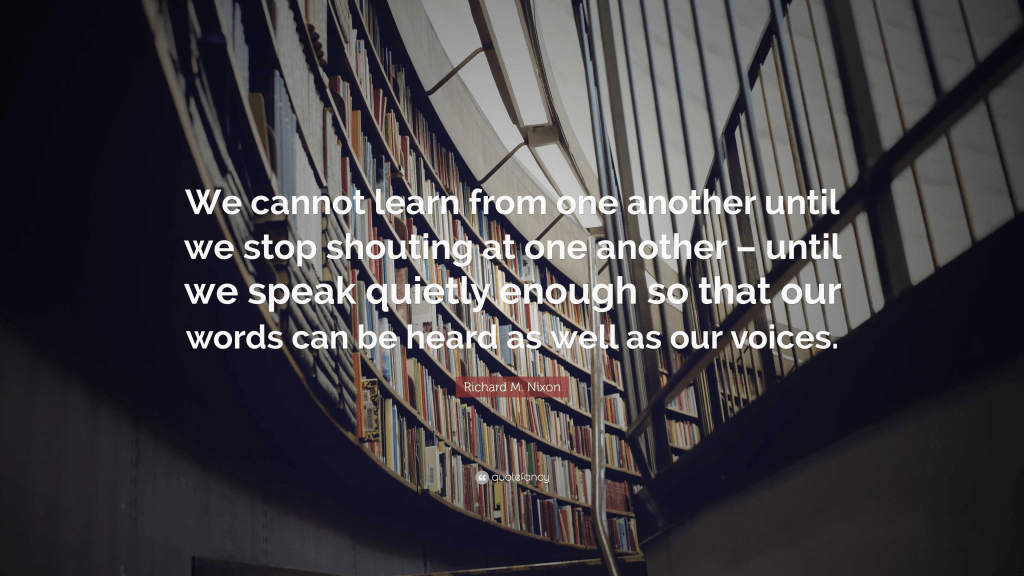 “In these difficult years, America has suffered from a fever of words; from inflated rhetoric that promises more than it can deliver; from angry rhetoric that fans discontents into hatreds; from bombastic rhetoric that postures instead of persuading. We cannot learn from one another until we stop shouting at one another, until we speak quietly enough so that our words can be heard as well as our voices.” – Richard M. Nixon