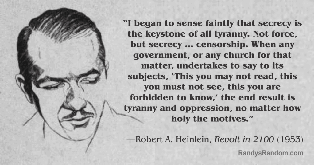 “I began to sense faintly that secrecy is the keystone of all tyranny. Not force, but secrecy…censorship. When any government, or any church for that matter, undertakes to say to its subjects, “This you may not read, this you must not see, this you are forbidden to know,” the end result is tyranny and oppression, no matter how holy the motives. Mighty little force is needed to control a man whose mind has been hoodwinked; contrariwise, no amount of force can control a free man, a man whose mind is free. No, not the rack, not fission bombs, not anything—you can’t conquer a free man; the most you can do is kill him.” – Robert Heinlein